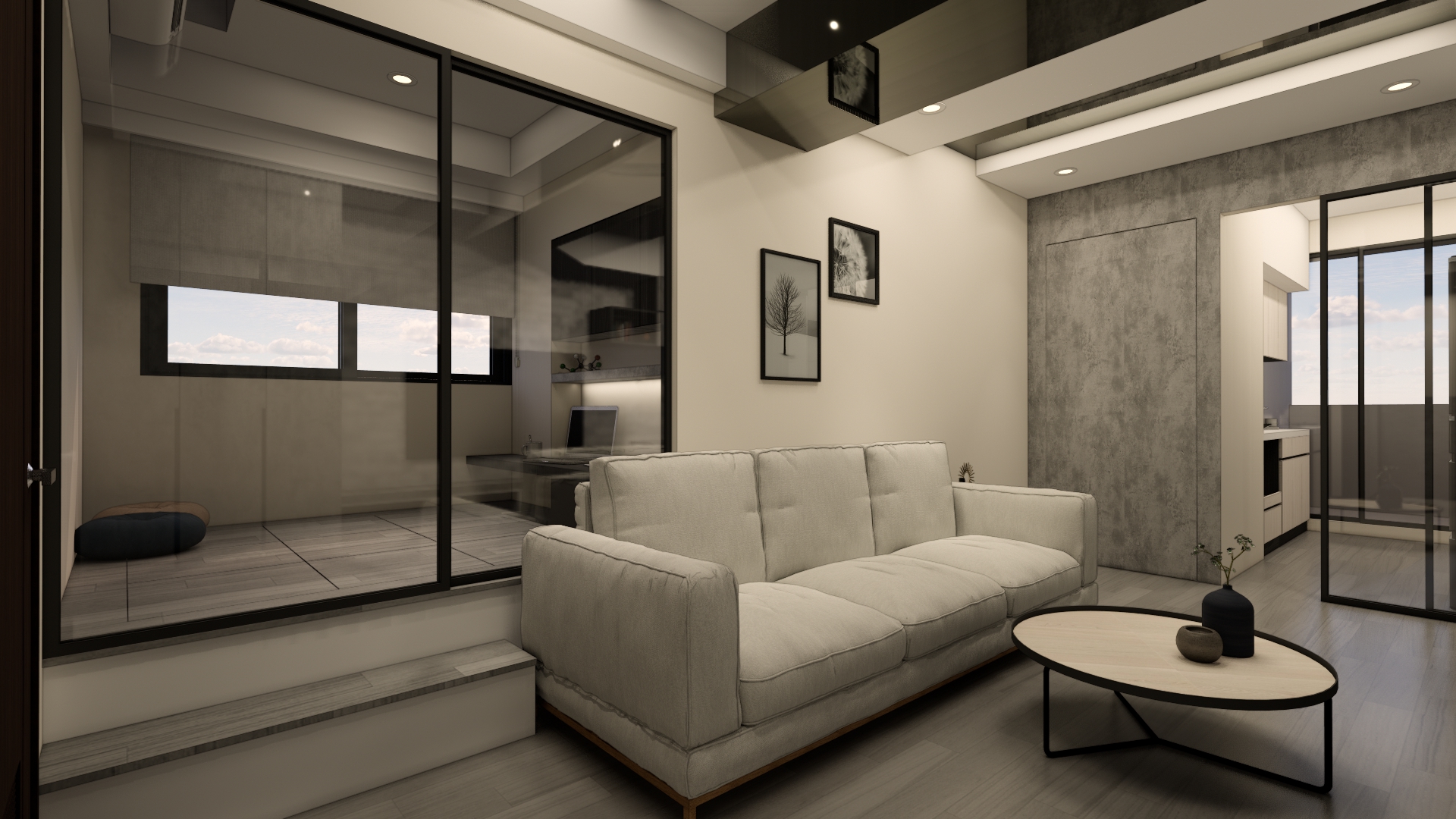 巧妙運用長虹玻璃滑門與同色系延伸,模糊空間邊界,讓 20 坪擁有 30 坪的開闊景深。